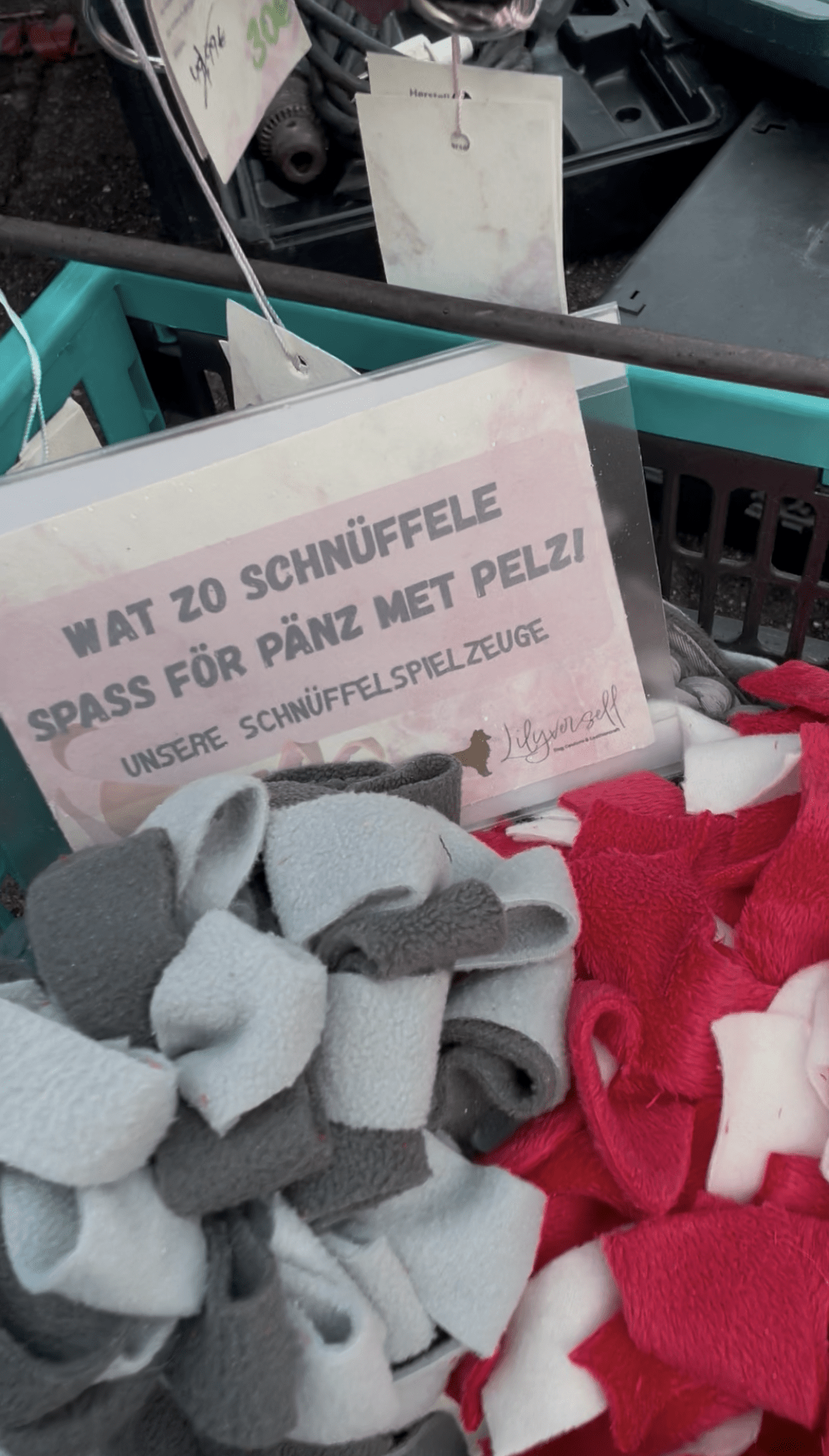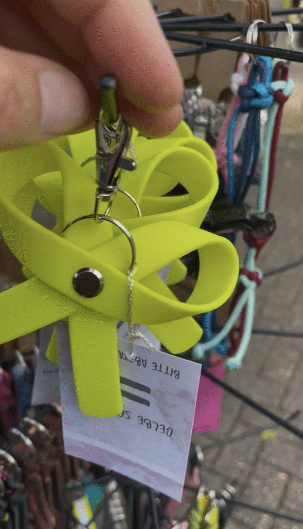 - Biothane®-Schlüsselanhänger mit Spruch – darunter „Dorfkind“, „Kölsch Mädche“, „Objöck“ oder „Veedelspfote“. Viele Besucher*innen fanden direkt ihr Lieblingsstück – ob für den Schlüsselbund, die Gassitasche oder als kleines Geschenk für Hundefreunde.