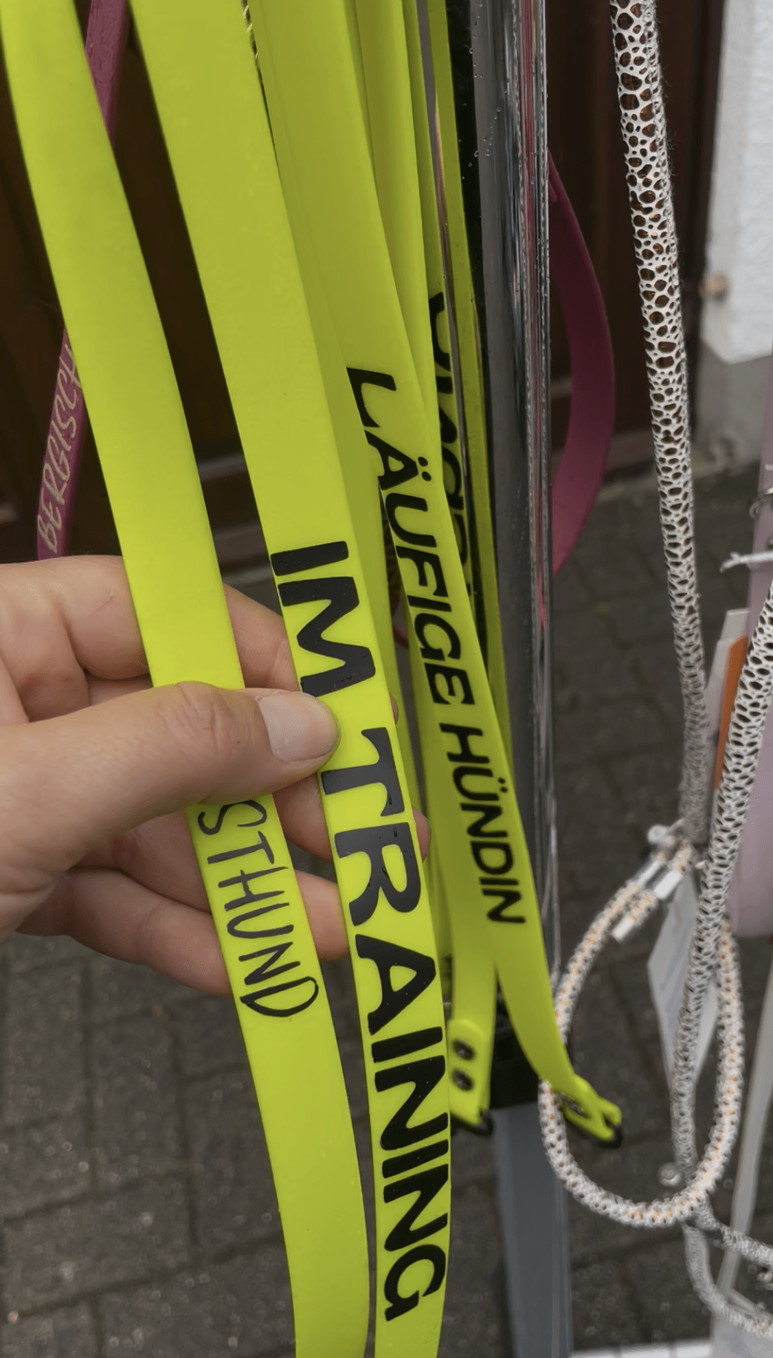 - Statement-Adapter aus Biothane® – kurze Zwischenstücke mit Karabiner vorne und Ring hinten, die zwischen Hund und eigentliche Leine geschaltet werden. Bedruckt mit Aufschriften wie „Läufige Hündin“, „Angsthund“ oder „Im Training“ machen sie auf besondere Bedürfnisse aufmerksam – ganz ohne Worte. Ideal, um anderen dezent zu signalisieren, dass dein Hund mehr Raum oder Rücksicht braucht.