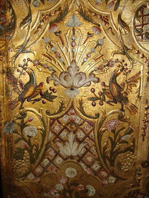 Gyldenlæder (golden leather). Wall leather covering, embossed. On the manor Rosenholm, Denmark