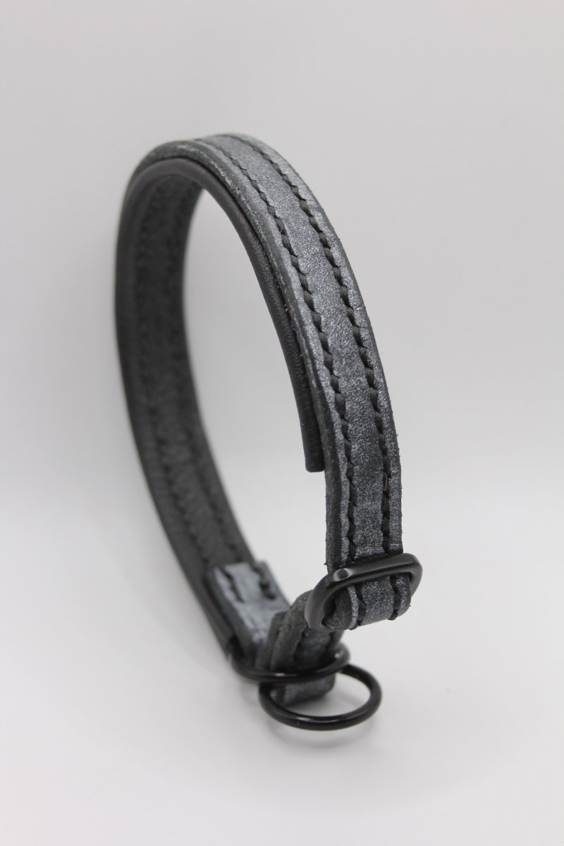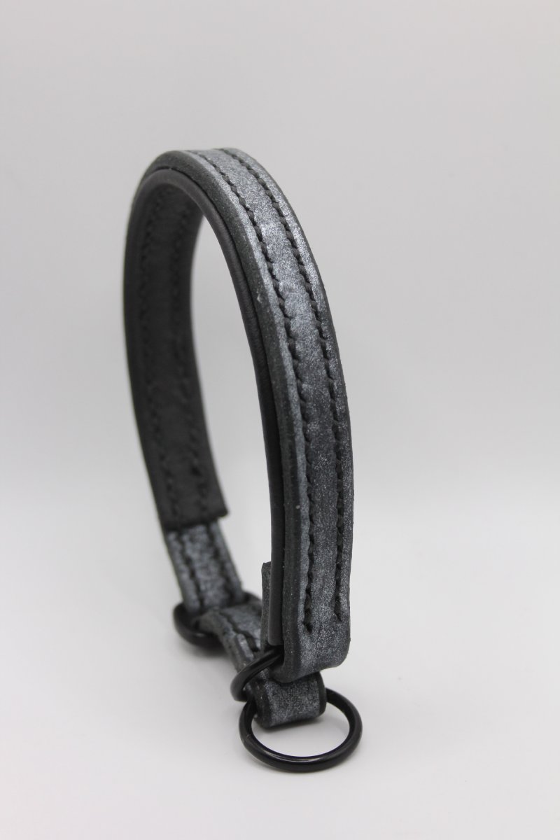 Durch eine spezielle Aufbearbeitung des hochwertigen schwarzen Fettlederriemens entsteht ein individueller Grunge-Look mit aschgrauer Struktur. Die Oberfläche wirkt wie mit Staub überzogen, leicht metallisch, beinahe urban – und genau das macht jedes Halsband zum Unikat.